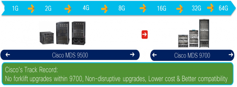 While Cisco has delivered dynamic investment protection since 2004, it’s taken competitors 15 years to make equivalent claims. In practice, Cisco continues to deliver investment protection with a seamless in-service software upgrade while competitor offerings consist of disruptive downtimes, higher risk and higher costs. Below is Cisco’s track record illustrating investment protection. Cisco has been shipping 64G-ready SAN directors since December 2019.