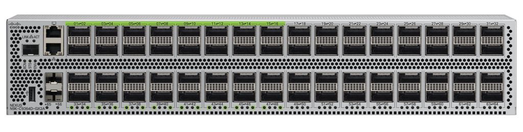 The upcoming 64-port, 400G Nexus 9300-GX2 switch will deliver up to 25.6 Tbps of throughput, in a 2RU enclosure. A more compact 32-port model will deliver 12.8 Tbps of throughput in 1RU. These switches will empower customers to transition from 100G to 400G without changing their current fan-out designs.