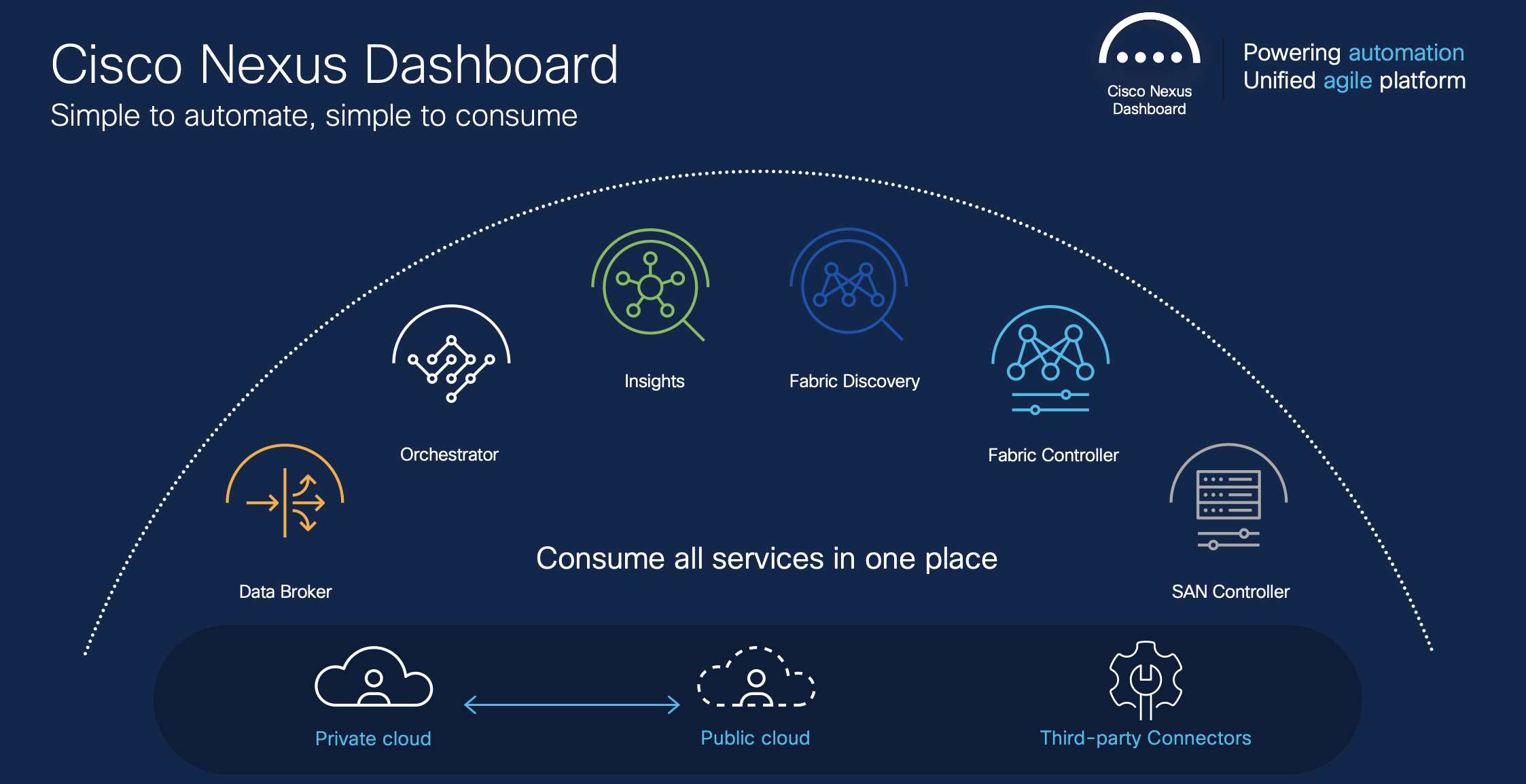 Automate and operate hybrid cloud networks with the intuitive and centralized management console, Cisco Nexus Dashboard, to streamline and rapidly ensure, change, scale, and troubleshoot. With Nexus Dashboard Insights, learn how to minimize troubleshooting time with flow analytics and one-click remediation across Cisco ACI or Cisco Nexus Dashboard Fabric Controller (NDFC) fabrics. NDFC manages Cisco NX-OS enabled deployments including LAN fabrics, SAN fabrics, and IP Fabric for Media (IPFM). Achieve extensive visibility, automation, and operations management for your Cisco Nexus-powered data center.
