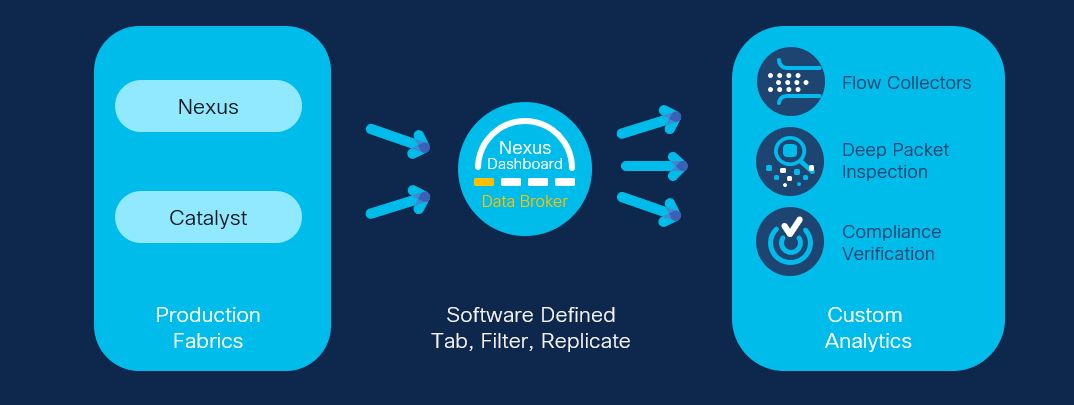 The enhanced Nexus Dashboard Data Broker (previously Cisco Nexus Data Broker) is now part of Nexus Dashboard, enabling NetOps to programmatically manage aggregating, filtering, and forwarding complete flows to custom analytics tools. The Nexus Dashboard Data Broker can be used with both Nexus and Catalyst fabrics. It replaces the traditional purpose-built network packet broker appliances with high-throughput Nexus switches enabling IT to create more scalable and cost-effective packet broker fabrics.