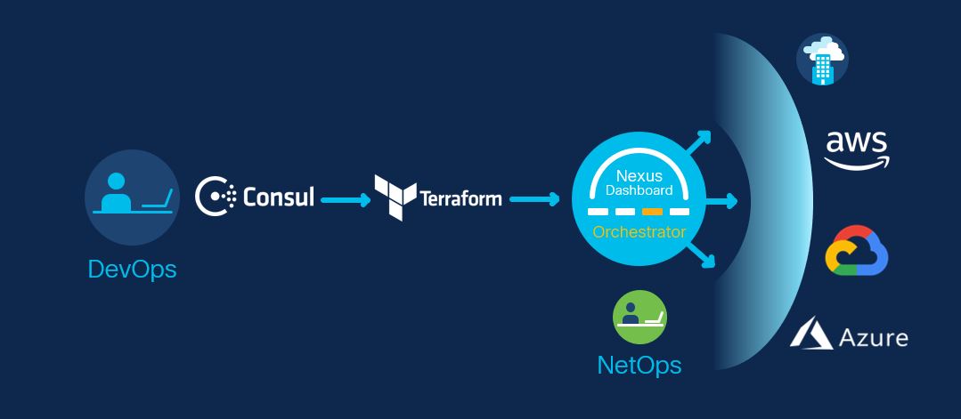 Via Cisco Nexus Dashboard, DevOps can improve the application deployment experience for multicloud applications with HashiCorp Terraform and Consul IaC integrations. Developers describe in code the components and resources needed to run an application in a data center or cloud.