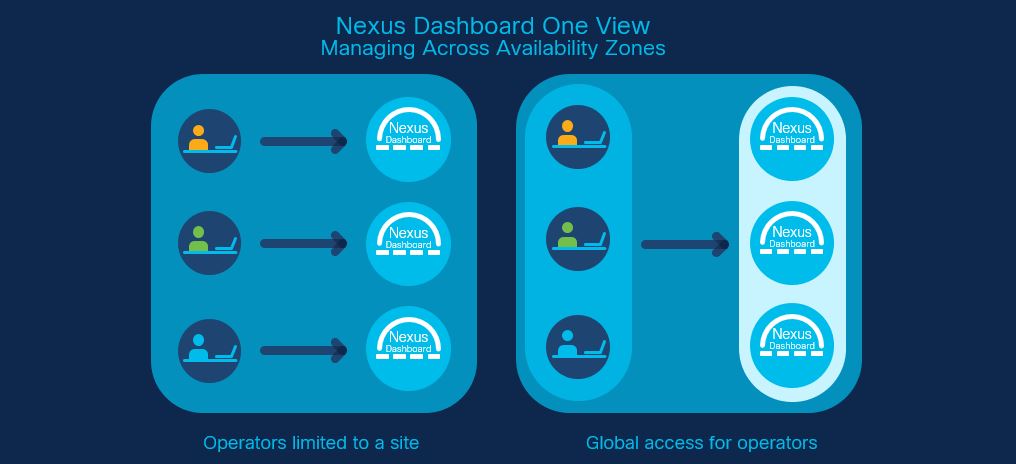 Each Nexus Dashboard instance can monitor multiple fabrics in a chosen availability zone and then roll status information up into a global Nexus Dashboard One View, providing full-stack observability across a global collection of fabrics. The full integration of Orchestrator, Insights, and Data Broker capabilities under the Nexus Dashboard is reflected in the updated names for each of these services.