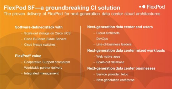 FlexPod SF will appeal to our traditional infrastructure buyers, as well as new cloud and virtualization buyers who are building next generation data centers. It delivers all the transformative capabilities you need to deploy new applications faster, more securely, with greater agility, and more cost-efficiently.