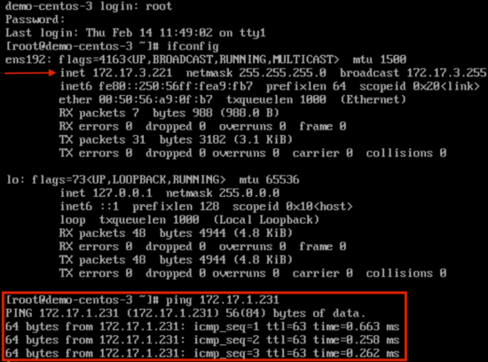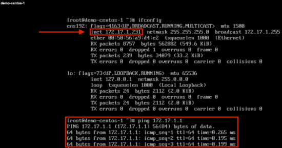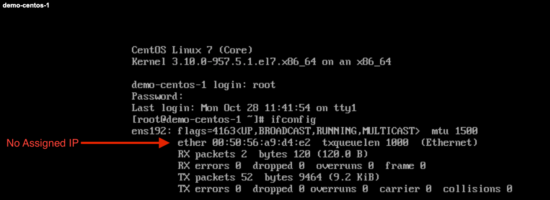 From within the vCenter web console for demo-centos-1 we can check if an IP address was properly allocated via DHCP.