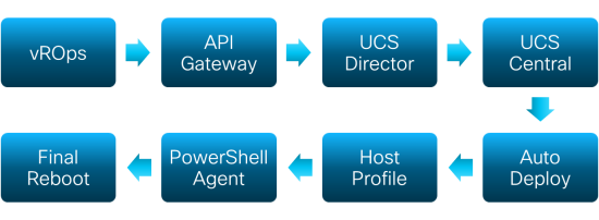 The focus of the solution they developed is the accessibility, speed, and reliability of VMware ESXi host provisioning, using Cisco UCS and the VMware hypervisor. The key to this solution is the software-defined nature of Cisco UCS hardware. The software components include Cisco UCS Director, UCS Central Software, VMware vSphere, and vROps. They implemented a step-by-step automated process that is summarized in the image below.