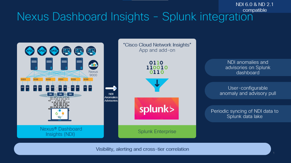 The Nexus Dashboard Insights and Splunk integration enables customers to gain deeper insights into the operational state of their infrastructure, accelerate troubleshooting, and improve operational efficiency.
