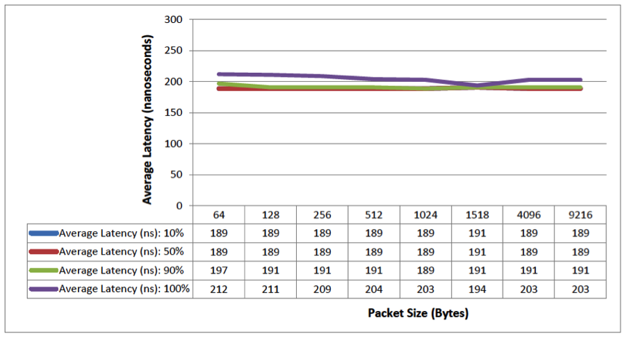 We can see that the Nexus 3548 consistently forwards packets of all sizes under 200 nanoseconds at up to 90% load, and less than 220 nanoseconds at 100% load.