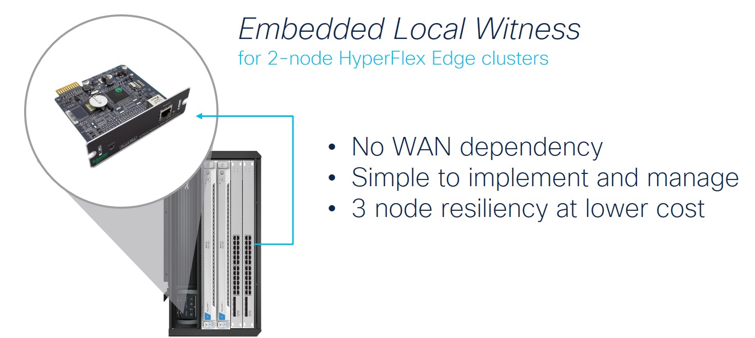 When we brought 2-node HyperFlex Edge to market, we introduced the Invisible Cloud Witness, which utilizes a SaaS delivery model through Cisco Intersight to eliminate the cost and complexity of hosting a VM or dedicated witness appliance in the datacenter or co-location. While the Invisible Cloud Witness simplifies 2-node operations and reduces both CapEx and OpEx costs, it still relies on WAN connectivity to ensure cluster operation. The new Embedded Local Witness runs within the enclosure on the APC UPS Network Management card to provide the on-prem resiliency of a 3-node cluster without the need for consistent WAN connectivity. This new option will still allow IT teams to leverage Intersight for remote install and management of HyperFlex Edge clusters but will decouple cluster availability to solve for deployment locations like ships, oil rigs, and very remote locations where connectivity is not always available.