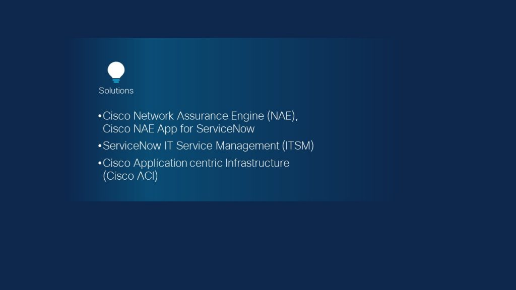 Cisco Network Assurance Engine (NAE), a key pillar in Cisco’s Intent based networking, is built on a strong foundation of open APIs that has enabled a broad ecosystem of partner-integrated solutions for automated, closed-loop incident resolution use cases, across scores of potential network issues. One such marquee solutions features Cisco NAE with ITSM leader ServiceNow that boasts hundredsof customer deployments across the globe. Cisco IT on its own is a stellar example of such deployments. A result of this implementation and deployment is a case study detailing highlights of Cisco IT’s success story. Cisco IT delivers applications and services that support 75,000 employees as well as partners and customers around the world. Its data center environment includes 10 production fabrics of Cisco Application Centric Infrastructure (ACI), 10 instances of Cisco NAE, and more than 70 network appliances, 35,000 endpoints, and 900 applications.