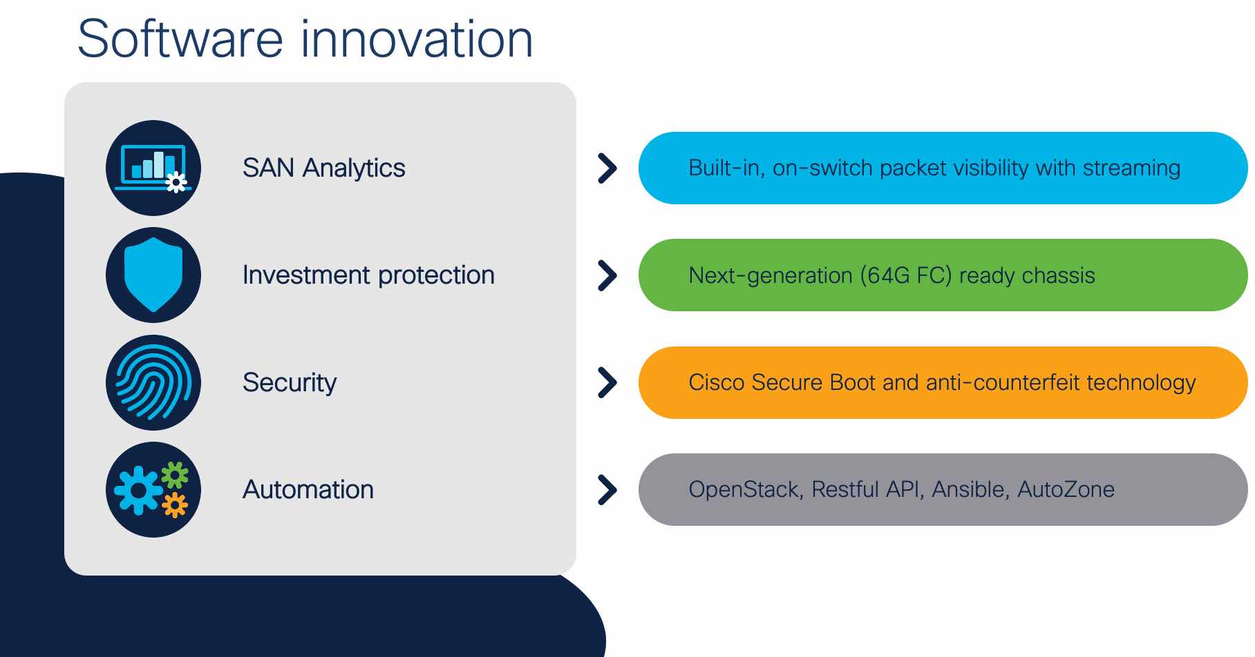 This is where the Cisco MDS 9700 Series Multilayer Directors continue their technical innovation to maintain feature superiority, in both directions – hardware and software.