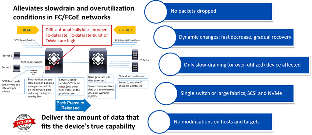 By default, when enabled, DIRL will only work on hosts. Having it operate on targets is also allowed, but considering that most congestion problems are on hosts/initiators and the fact a single target port has a possible impact on multiple hosts, this needs to be explicitly configured by the administrator. With DIRL, no Fibre Channel frames are dropped and no change is needed on hosts nor targets. It is compatible with hosts and targets of any vendor and any generation. It’s agentless. It is a fabric-centric approach. It is all controlled and governed by the embedded intelligence of MDS 9000 devices. Customers may chose to enable DIRL on single switch deployments or large fabrics. Even in multiswitch deployments or large fabrics DIRL can deployed on only a single switch if desired (for example for evaluation). Clearly DIRL operates in the lower layers of the Fibre Channel stack and this makes it suitable for operation with both SCSI and NVMe protocols.