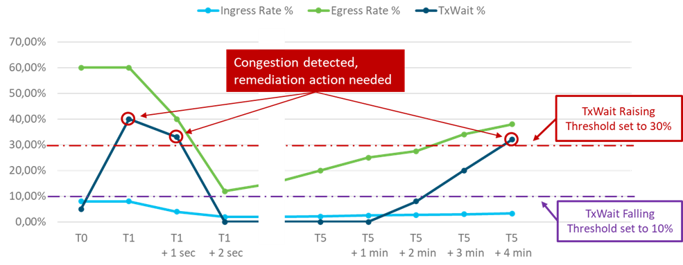 T1+2 sec: ingress rate reduced by another 50%, egress rate also reduced by some amount, TxWait counter now down to zero, congestion eliminated