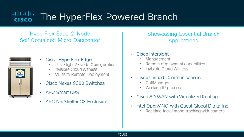 We invite you to come experience the “HyperFlex Powered Branch” powered by a live HyperFlex Edge cluster in the latest 2-node configuration running essential branch applications like Cisco SD-WAN and Cisco Unified Communications as well as demonstrating key innovation enabled through Cisco Intersight that simplifies deploying, managing and maintaining edge computing solutions.
