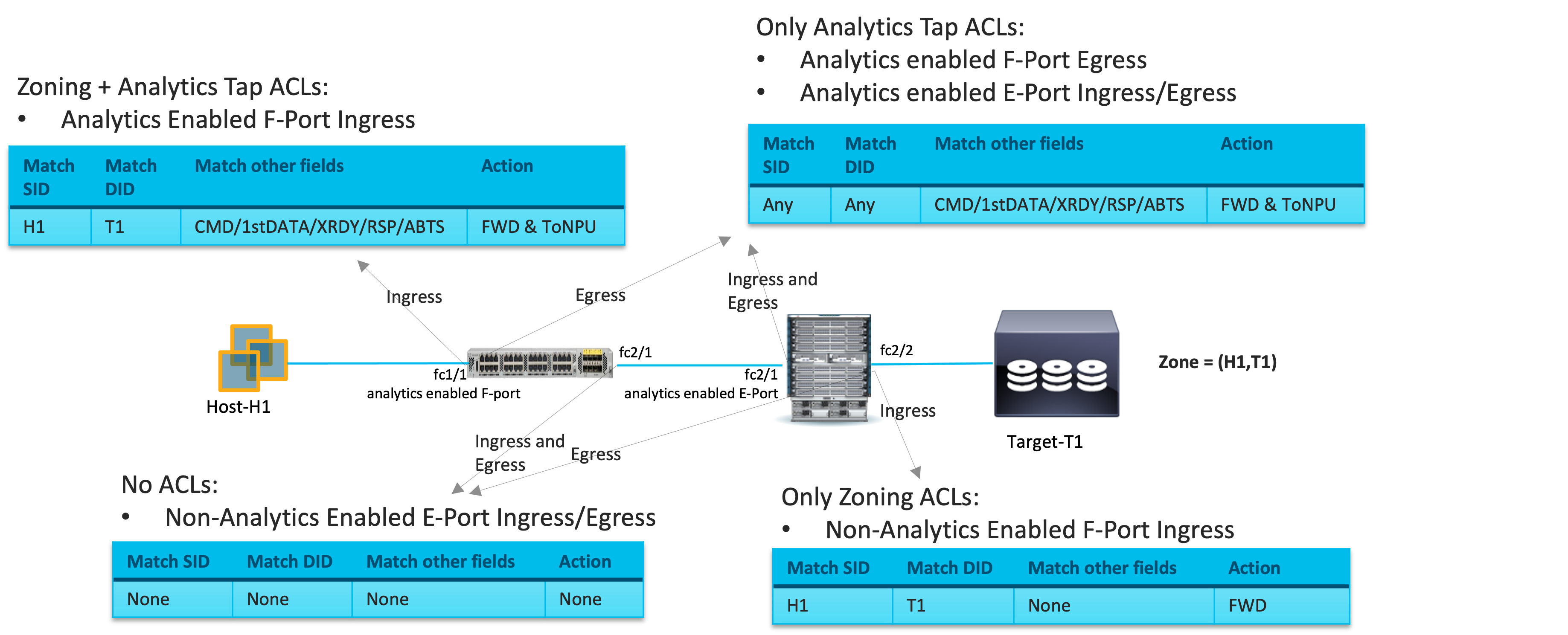 - F_Port Ingress: Analytics Tap ACLs + Zoning ACLs