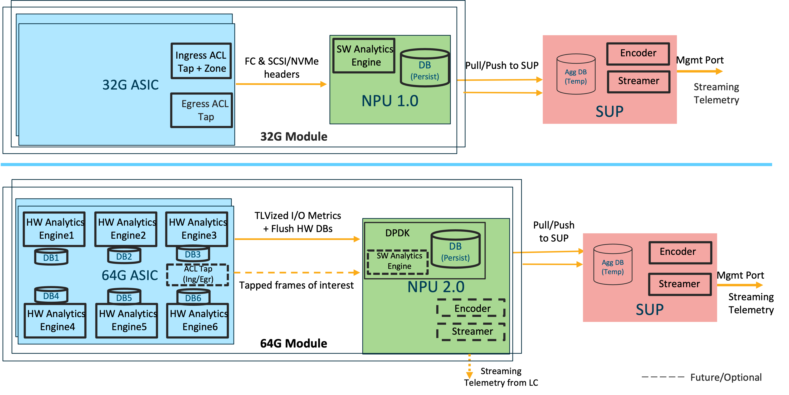 The Cisco MDS 32G NPU software Analytics Engine can be modified to accommodate custom metrics (Eg: NVMe Flush command metrics) or futuristic storage command sets (Eg: NVMe-KV) with the required ACL Taps in place.