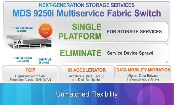 The MDS 9250i is a single platform for Storage Services and can handle different types of applications efficiently including SAN Extension/Business continuance / Disaster Recovery solutions, FC SAN Gateway for seamless multiprotocol connectivity and data migration applications.