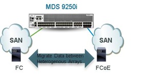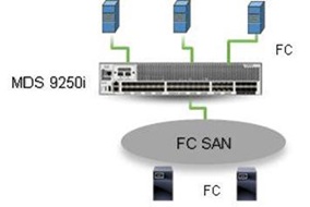 The Cisco MDS 9250i switch servers as a gateway between FC and FCOE SAN enabling seamless multiprotocol connectivity |