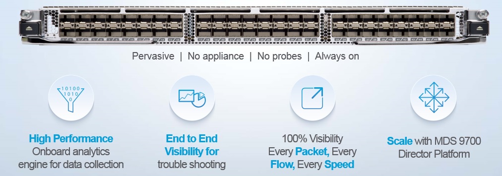 - Integrated analytics Think deep visibility for your SAN operations: This includes the ability to monitor all flows on all ports at line rate to empower storage admins with the ability to make informed and proactive operational decisions. Cisco achieves this through a built-in analytics engine on the new 32G FC Module that is hardware-based and purpose-built for maximum performance. It is capable of IO-level metrics that are computed in every switch through dedicated Network Processor Units. Customers can now analyze in real time all Fibre Channel exchanges and report on various metrics, thereby providing comprehensive, timely, and continuous monitoring of any potential performance issues or deviation in the network.