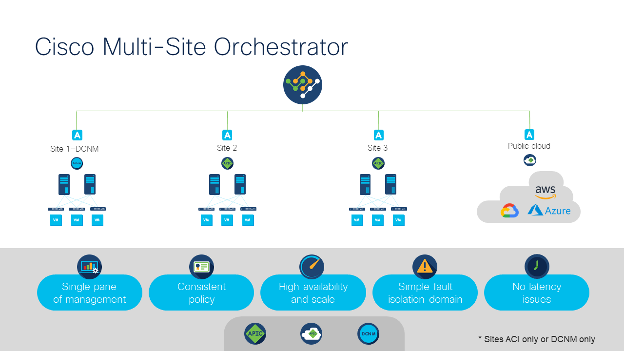 MSO allows you to interconnect separate Cisco® Application Centric Infrastructure (Cisco ACI®) sites, Cisco Cloud ACI sites, and Cisco Data Center Network Manager (DCNM) sites, each managed by its own controller (APIC cluster, DCNM cluster, or Cloud APIC instances in a public cloud). The on-premises sites (ACI or DCNM in the future) can be extended to different public clouds for hybrid-cloud deployments or for cloud-first multi-cloud-only deployments between cloud sites that do not have an on-premises site.