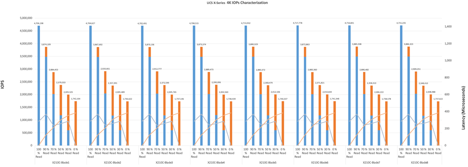 - Each blade server generated approximately 4.7 million sustained IOPs at 100% reads with total around 37+ Million IOPs at nearly 500 Microseconds latency with 4K data blocks.