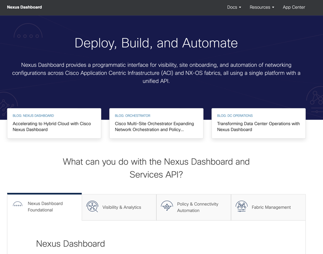 We have touched on this in previous blog posts, but still would like to dive a bit deeper into how we are making improvements to our API documentation, providing for a better developer experience. Every API-enabled product (and the cloud networking product lines are no exception) has an API documentation microsite. This microsite (an example for ACI is shown below) contains not only the API guide, but background and context about the APIs and their design principles, model references (where appropriate), and links to external pages, such as IaC modules/providers, sandboxes that can be used to explore the APIs, learning labs, and developer community support forums for questions that may arise during API exploration. These documentation pages also support multiple versions of the API – meaning that regardless of the version you are running – you can find an API reference for it on our portal.