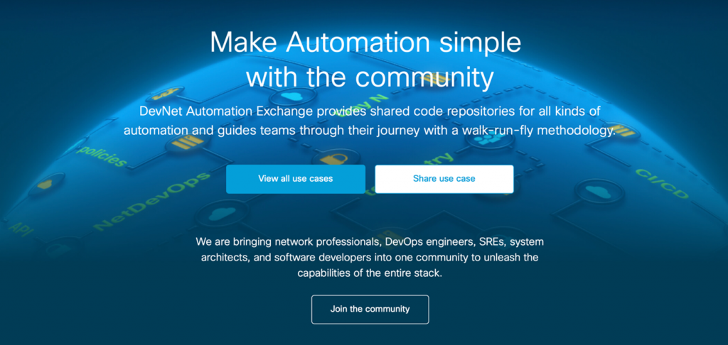 One final (and often overlooked) component within the DevNet website is the Code Exchange and Automation Exchange platforms. Each of these platforms allow you to search for curated content relevant to your needs and use-case, each with a different bent: Code Exchange (CE) focuses on simple code samples that can be used as a starting point for creating a larger solution, while Automation Exchange (AE) focuses on driving a single use-case through to its automated completion. Both CE and AE help developers, both novice and experienced alike, get started on a project by using other prior work as a source of inspiration or a building block for further tasks. I know that I have been inspired on several occasions to create something using someone else’s work as a starting point (with proper attribution to the original developer, of course). You can find Code Exchange and Automation Exchange by clicking on the embedded links in their names.