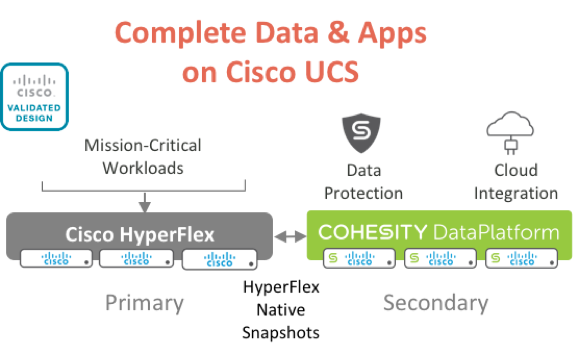 The Cisco and Cohesity solution consolidates primary data and apps on Cisco HyperFlex™ with secondary data on the Cohesity DataPlatform, all built on one unified architecture based on the Cisco Unified Computing System (UCS).