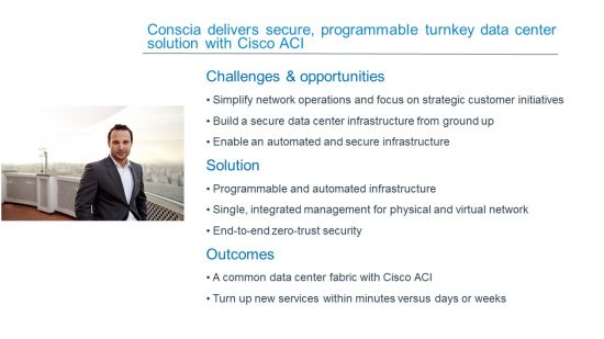 “Cisco ACI offers us a programmable, hypervisor agnostic and highly secure data center infrastructure, but what took us by surprise was the ease of management it provides. We were able to turn up new services within minutes…” Henrik Moll, Acting CTO, Conscia