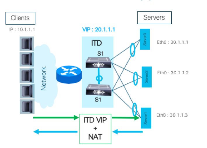In the above example, clients send the traffic to the ITD virtual IP address (20.1.1.1), assuming it as real destination IP of the server. ITD switch translates and load balances the traffic to one of the server’s private IP address by adding its own IP as the source IP. The return traffic from the server is translated by ITD to its own VIP as source IP and forwarded back to the client. This way the traffic gets load balanced across the servers behind NAT without exposing the real-IP of servers to clients.