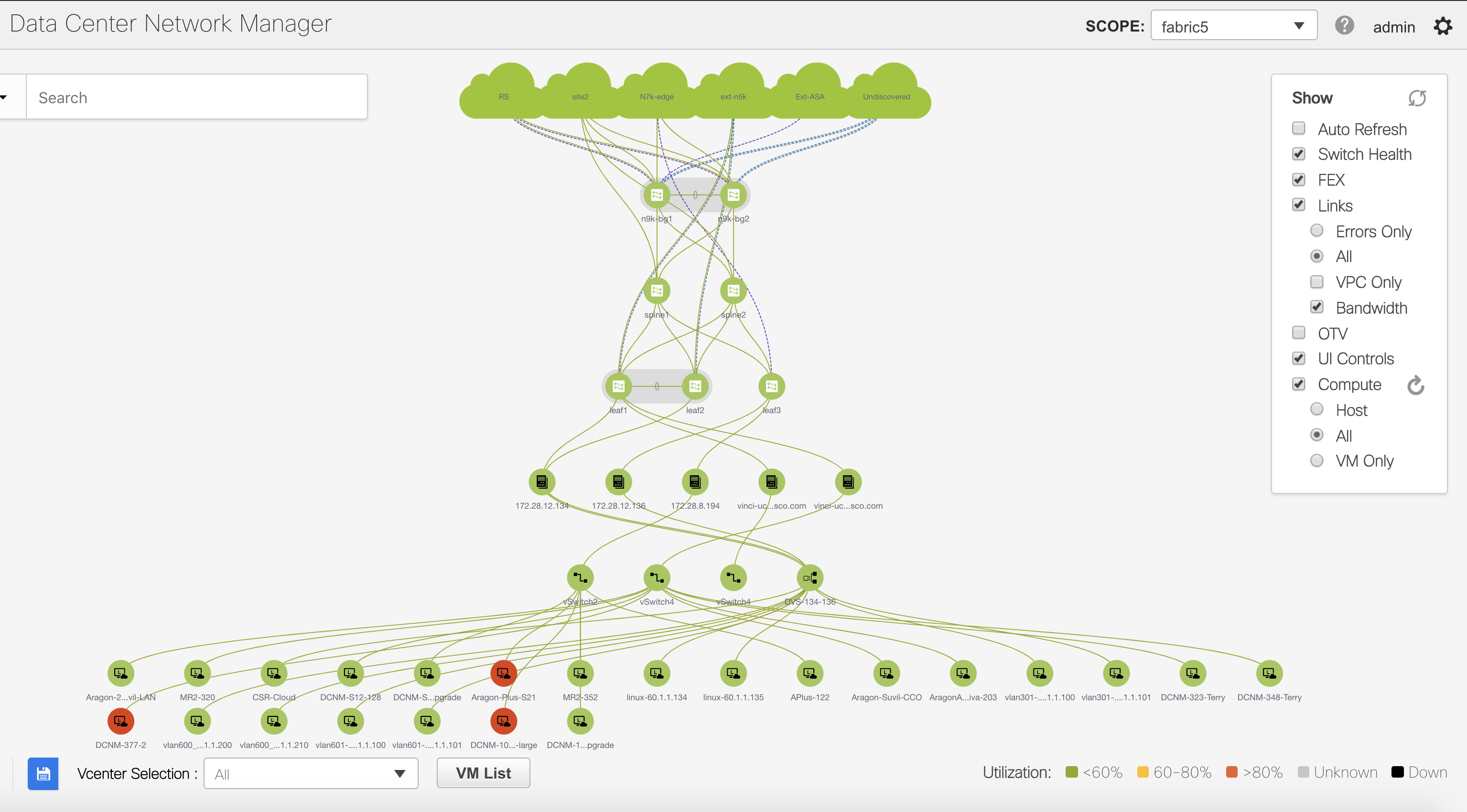 A novel microservices based architecture with an application framework, enables DCNM to host native as well as 3rd party applications. This holistic framework provides the entire life cycle management of the application, including support for a scale-out clustered mode that allows compute elements to be dynamically added to the DCNM “mothership” to address the needs of a growing network. An example application, hosted on the DCNM that provides compute visibility from the network edge, all the way to the VMs, is depicted below: