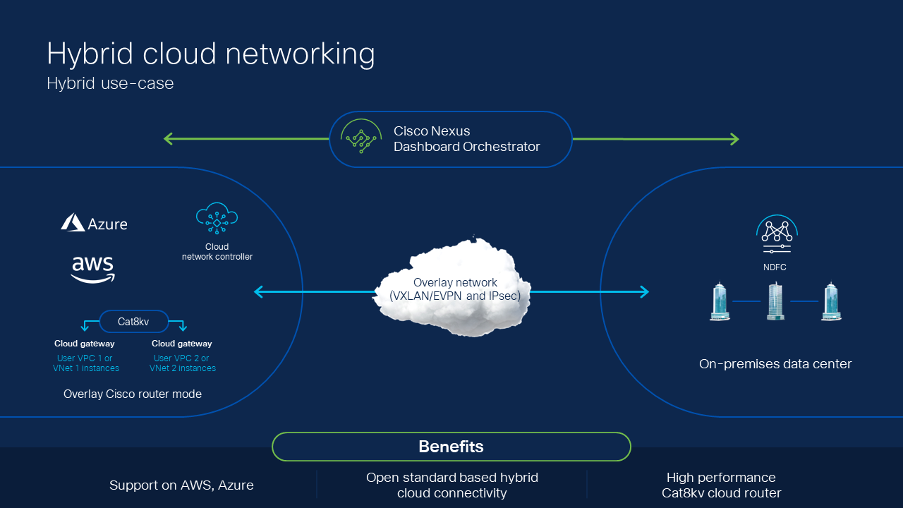 - Hybrid cloud connectivity to AWS and Azure for deployment flexibility: The Hybrid Cloud Solution will support seamless connectivity between on-premises and cloud networks. With NDFC, users can manage their on-prem VXLAN fabrics. Other key components include Cisco Nexus Dashboard Orchestrator (NDO) which will establish connectivity between on-prem and cloud sites sending policies to the Cisco Cloud Network Controller (CCNC). The Cisco Cloud Network Controller provides automated connectivity, policy translation, and enhanced visibility of workloads in the public cloud. CCNC will translate policies from NDO and program them into cloud-native constructs. NDFC 12.1(2) Hybrid Cloud solution will provide support for Microsoft Azure and AWS public clouds.