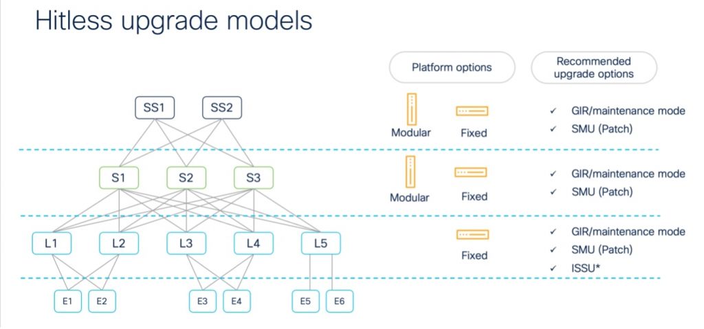 Designing a highly redundant network involves several strategies to ensure continuous operation and minimize downtime. Key approaches include multiple network paths between critical points, load balancing, and dual-homed devices and switches. Cisco supported hitless upgrades for data centers built with Cisco Nexus switches in both Cisco Application Centric Infrastructure (ACI) and NX-OS operating models. Let’s explore the hitless upgrade options available in Cisco NX-OS and the Cisco recommended best practices.