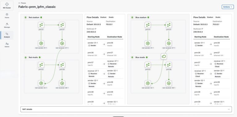 - End-to-end flow visibility for multisite fabrics: To support the growing adoption of remote production sites, Cisco Nexus Dashboard now extends its flow visibility to include remote traffic. This capability ensures complete monitoring of remote senders and flows, significantly simplifying monitoring and troubleshooting processes.