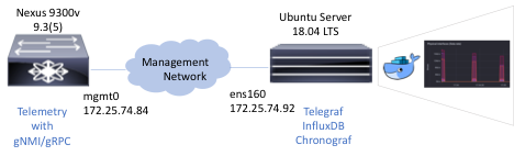 In the example below, the setup is entirely virtual and is built with just two devices: A Nexus 9300v switch running 9.3(5) and an Ubuntu server running 18.04 LTS. You could set up the same environment with any Nexus switch with reachability to a host.