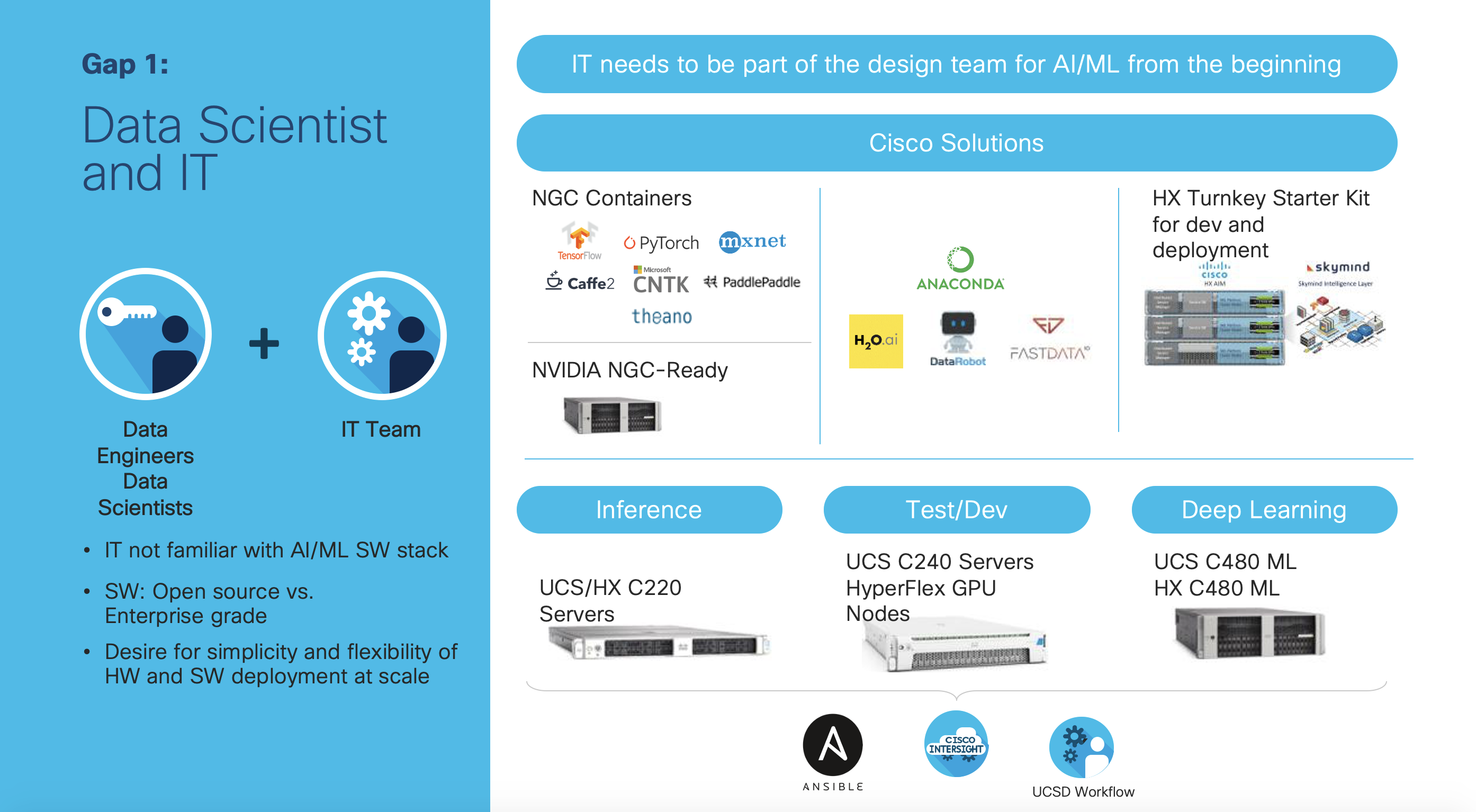 Earlier this year, at Cisco Live Barcelona, I had an opportunity to give multiple presentations at the World of Solutions area. When I asked the audience whether they knew how to deploy a virtual machine, almost everyone’s hands went up. As a follow-on question, I asked whether the audience knew how to deploy GPU enabled TensorFlow on a server, and almost nobody’s hand went up. Here’s the striking reality: IT teams may not know what hardware and software that the data scientists need. Without this knowledge, the two teams cannot effectively work together. That’s why we’ve crafted a variety of Cisco Validated Designs and Solution Briefs, in partnership with NVIDIA, Cloudera, Intel, and many others, to ensure that our customers have the right blueprint for accelerating AI/ML deployment with Hadoop, Kubernetes, hybrid cloud environments, and more. With the portfolio of networking and servers, infrastructure for the complete data pipeline can be architected, from the cloud to data center to the edge of the network. These offerings enable IT customers to have effective dialogues with the data science team.