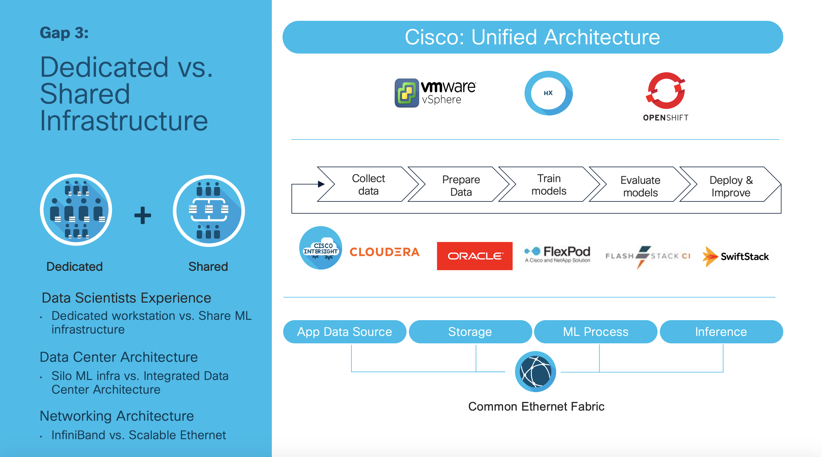 I have spoken with many data science teams who make it a practice to have GPU servers at their desk so that they have exclusive access. From an IT perspective, dedicated resources often have low utilization and difficulty justifying the added budget. As a result, Cisco has been working with a variety of partners, from VMware, Red Hat, and others, to create multiple cluster-wide solutions. For example, a Red Hat OpenShift cluster allows some resources to be dedicated and others to be shared. Hence, data science teams can have the dedicated resources for their own use, and have a pool of GPU resources to share when they want to do compute-intensive workloads, such as hyperparameter tuning. In a similar way, a cluster of HyperFlex with virtual GPU or PCI passthrough can also be shared and reserved for the data science team. With Cisco’s unified architecture, even mission critical applications, such as Oracle and SAP, run on the same architecture. These applications are important data sources for AI/ML, which is why IT, in using Cisco’s unified architecture, is able to create an architecture that can be scaled appropriately for both traditional enterprise applications as well as the latest AI/ML workloads. Cisco’s unifying architecture enables IT to accelerate AI/ML deployment, just as it has done with previous applications.