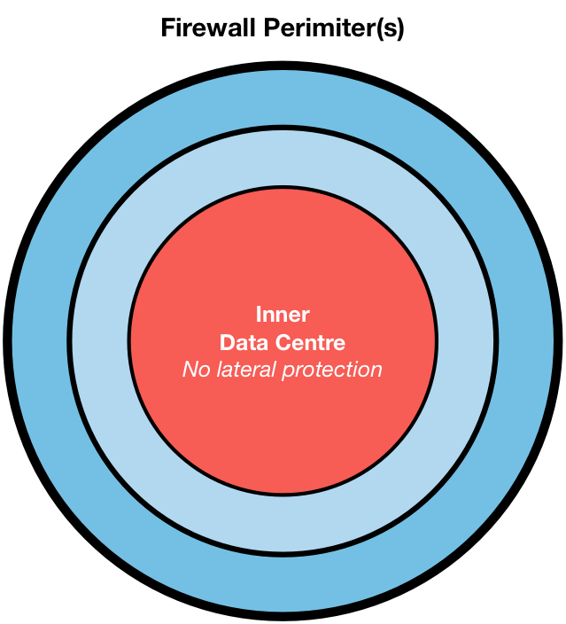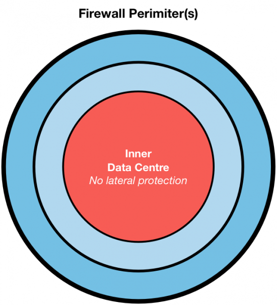 For many years, unfortunately, this advice has gone unheeded; a dangerous majority of data centres simply do not whitelist traffic. Usually network segmentation consists of a few boundaries, heroically guarded by firewalls, checking all whom enter or exit, but once inside the trusted zones, lateral movement is not controlled, save the limited isolation that VLANs and subnets provide (hint: it’s not much).
