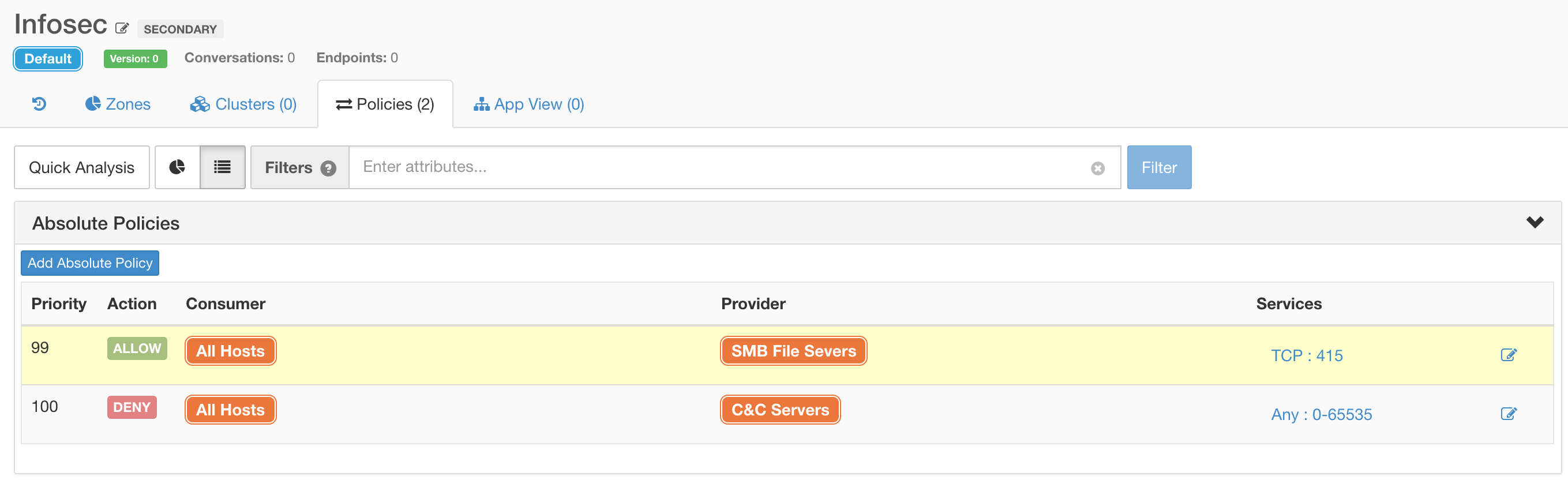 After automatically analysing your applications, you can overlay extra security policies that capture your intent, automatically translating that into the necessary firewall rules on workloads. Simple expressions like DENY communication from “All Hosts” to “WannaCry C&C Servers” can be captured and enforced across the entire data centre.