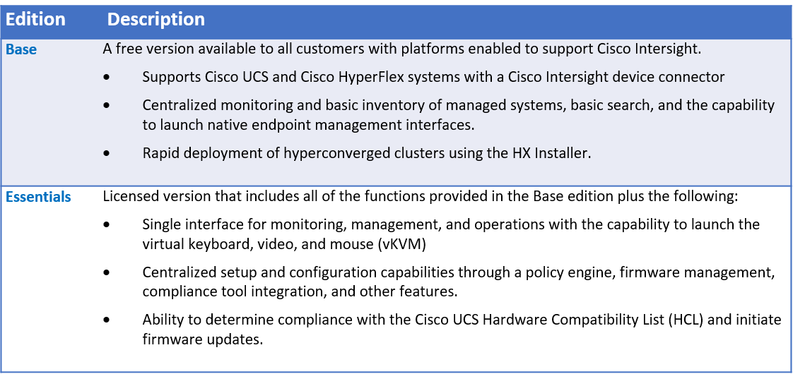 Cisco Intersight will initially be available in two editions: Base and Essentials. We wanted to encourage customers to begin using Intersight, so the Base edition of the product is available at no charge. The Base edition was released in a Tech Preview last month. If you’d like to participate in the Tech Preview, read this blog to learn more.