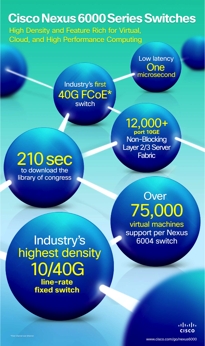 The Nexus 6000 Series represents a breakthrough innovation in scale – by delivering industry-leading 10GE / 40GE port density in a fixed form factor with Layer 2/Layer 3 and consistently low latency –1 microsecond across all ports.