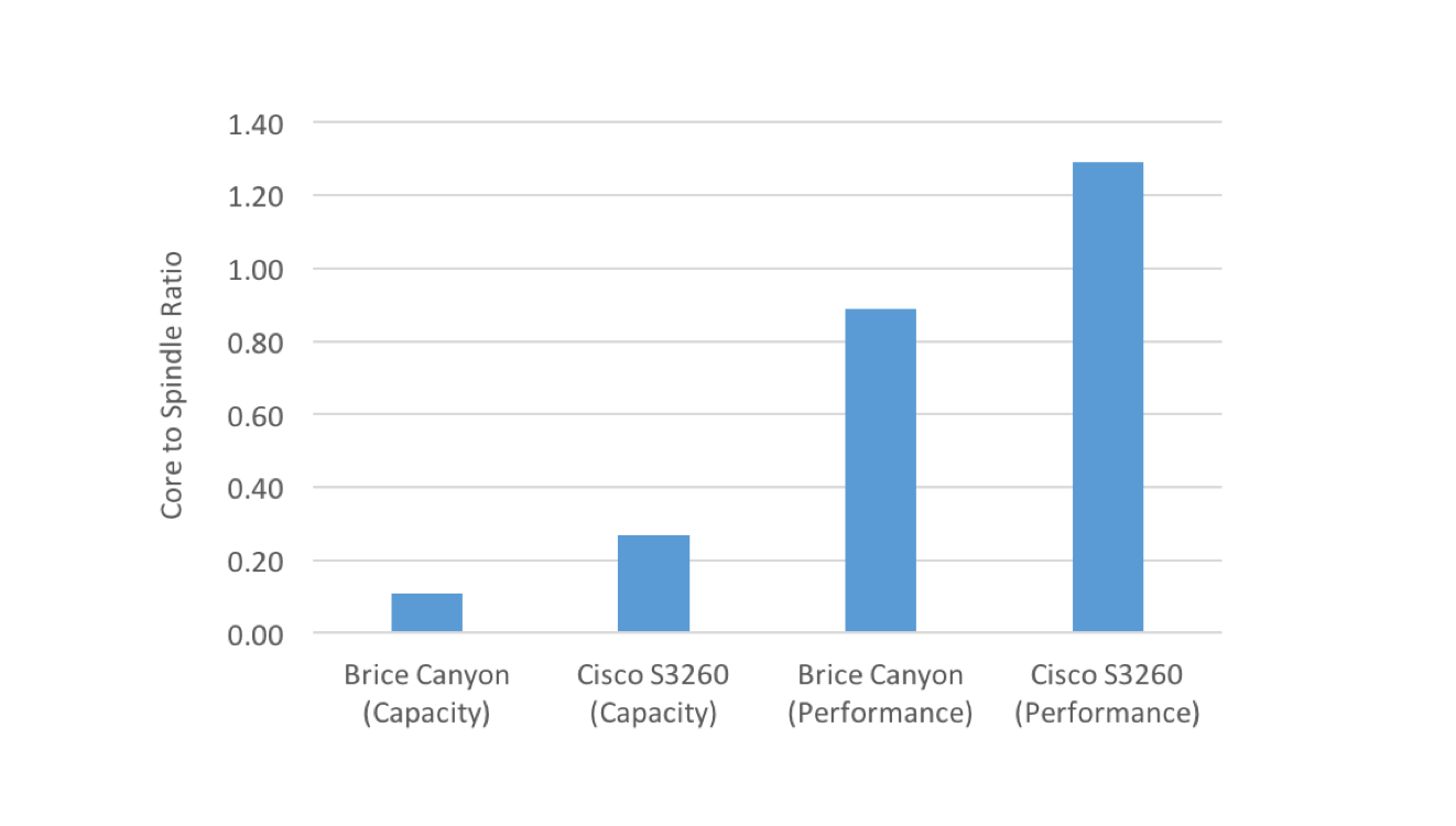 A major difference with our S3260 server nodes vs. Mono Lake is form factor. Our dual-socket architecture combined with the current Intel Xeon E5-2600 v4 processors create a total of 36 cores per server node satisfying the most performance hungry use cases. This creates a 1:28.1 core to spindle ratio per server that is attractive for performance hungry workloads like our Big Data and Analytics solutions. As a proof point, check out this great blog from my colleague Rex Backman on recent S3260 big data performance benchmarks validated independently by certified TPC Auditors.