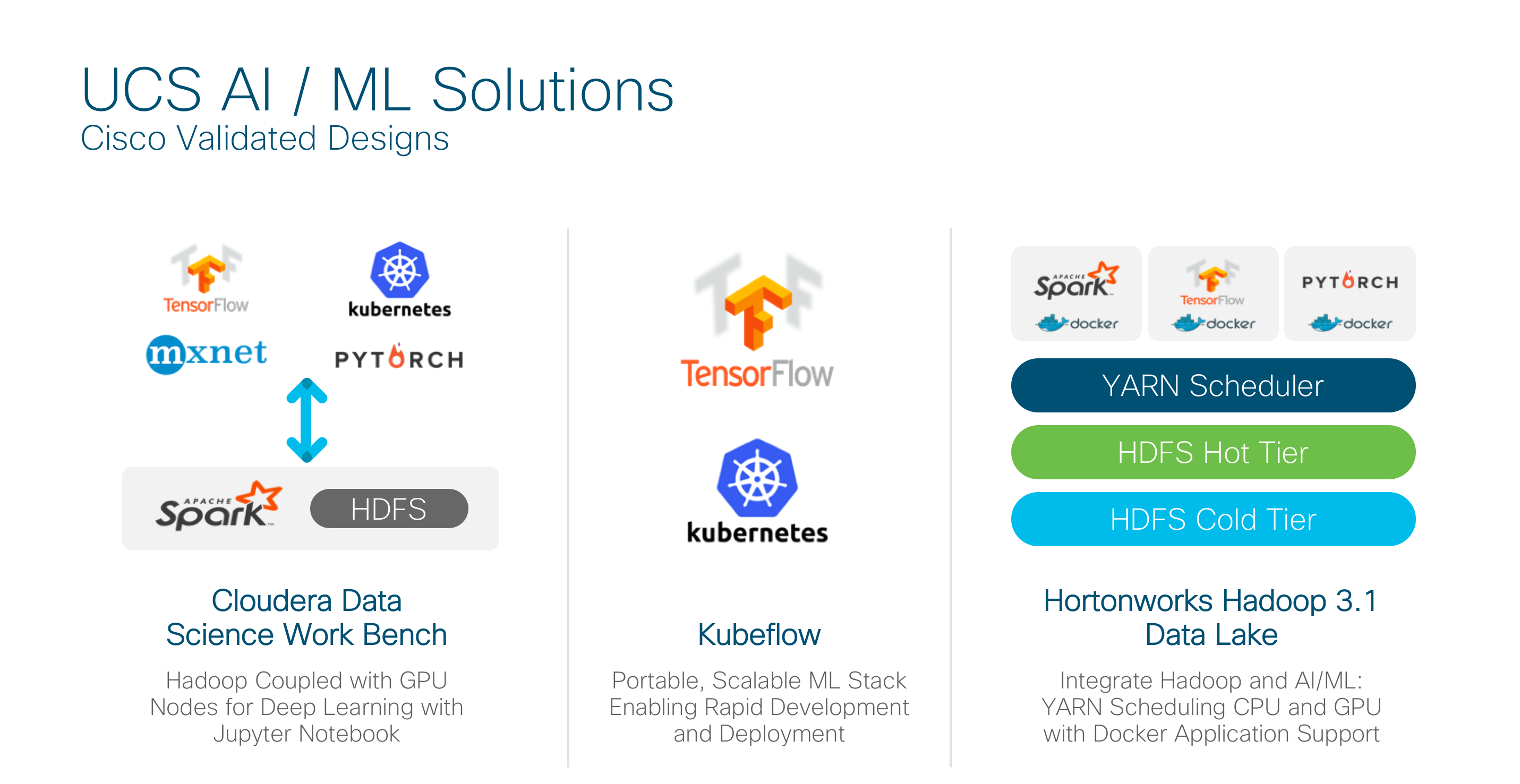 Let’s highlight some examples of Cisco Validated Design supporting machine learning. One of the prerequisites of machine learning is data itself. For many Cisco big data customers, they already have a data lake in Hadoop that requires further analysis to extract more value from the data. Hence, Cisco has partnered with Cloudera to create a CVD using Cloudera Data Science Workbench enabling customers to tap into the Hadoop data lake and use the latest machine learning frameworks such as TensorFlow and PyTorch. In a similar way, Hortonworks 3.0 also has the latest YARN scheduler that is able to schedule workloads on CPU and GPUs to support workloads like Apache Spark and TensorFlow as Docker containers1 . This solution enables IT teams to scale the CPU, GPU, and storage.