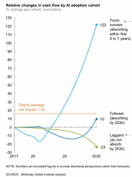 Yet, it has never been more important to take advantage of machine learning. According to the McKinsey report, being one of the first to adopt artificial intelligence has huge implications on future cash flow.