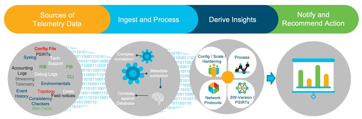 Nexus Dashboard Insights excels at analyzing these relationships and trends over time and comparing it to baselines that define the boundaries of normal operation, best practices, and a healthy state. This is heavy work for humans, but trivial for Nexus Dashboard Insights.