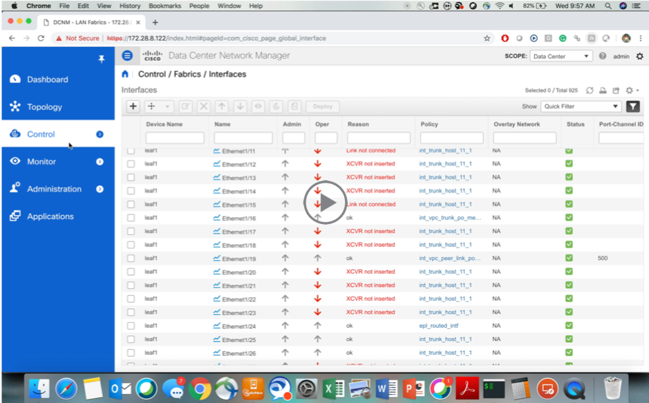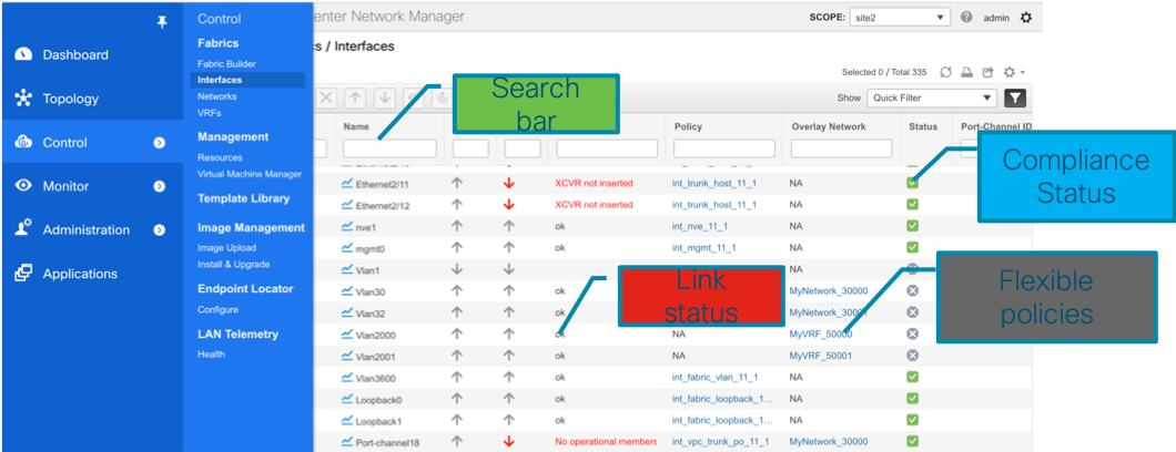 Interface of Switches discovered by DCNM can be seen by navigating to Control -> Fabrics -> Interfaces. The scope selector allows you to filter the list of interfaces at a Data Center level or at a per fabric level. Various filtering options are available, including the ability to modify interface configuration in bulk. The global interface view provides a combination of information that is configured via the DCNM as well as operational information based run time state.