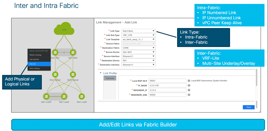 Typically, there are two types of interfaces: network interfaces that represent a inter-switch link or ISL, and host facing interfaces that are typically attached to end points (servers, appliances etc.). An ISL or a link may be further classified as a intra-fabric or inter-fabric link. Intra-fabric links are between devices that are part of the same fabric, while inter-fabric links are typically used for external connectivity out of a fabric. DCNM allows users to pre-provision inter and intra fabric physical and logical links using link policy templates. A link policy template in turn references child interface policy templates, one each for either end of the link.