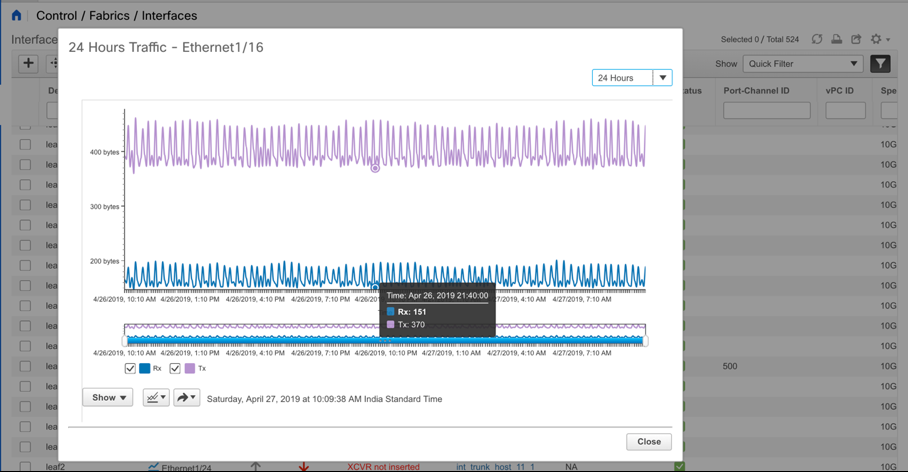 DCNM then gathers and populates interface level statistics in the health dashboard. Interface and per link statistics – including transmit/receive byte/packet counters, error counters, and more – are available for archival and perusal. Daily or weekly reports may also be generated for interface statistics.