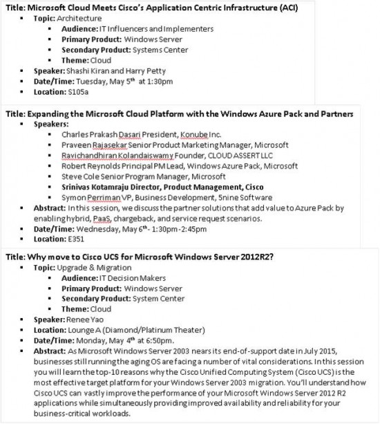 @HighTechBill Thanks! FYI, here is the link again to our speaking sessions and in booth Cisco theatre sessions (#122) http://www.cisco.com/web/learning/le21/le34/msignite/index.html#speakers