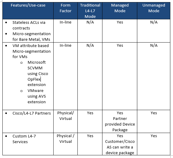 While there are benefits of full automation including configuration of L4-L7 devices, some customers have requested to provide “unmanaged” mode for their custom devices or as a migration path to full automation.