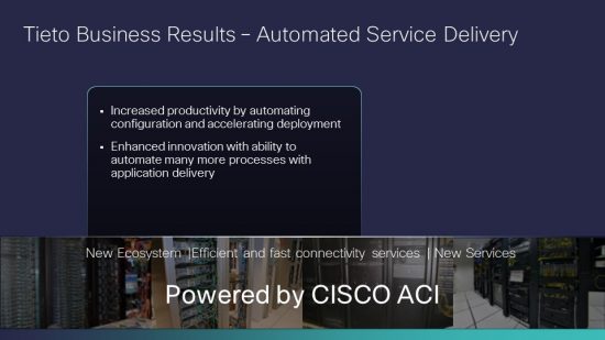 “We have had a long experience with Cisco products and services,” said Jyrki Halonen, Lead Service Architect at Tieto. “The Cisco team helped us fine-tune our SDN plan to deploy the solution as quickly as possible.” The Cisco ACI™ solution, with its industry-leading software-defined networking (SDN) capabilities, provides a holistic architecture with centralized automation and policy-driven application profiles.ACI delivers software flexibility with the scalability of hardware performance.